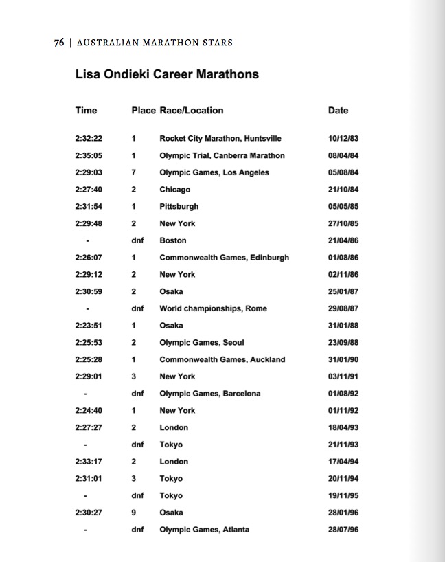 Ondieki is pure class, a big time championship performer, the only Australian ever to place in an Olympic Games marathon. Some of her career highlights include: